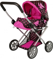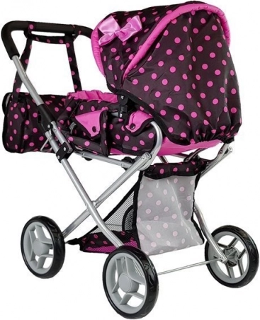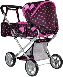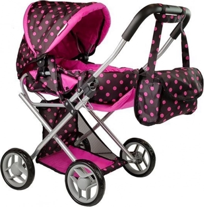Il passeggino Alice per bambole è leggero, facile da manovrare e perfetto per tutte le piccole "mamme". La struttura è in metallo resistente, il che assicura stabilità e lunga durata. Il design nero-rosa con pois conferisce al passeggino un aspetto elegante, mentre la funzione pieghevole permette un facile trasporto e stoccaggio.