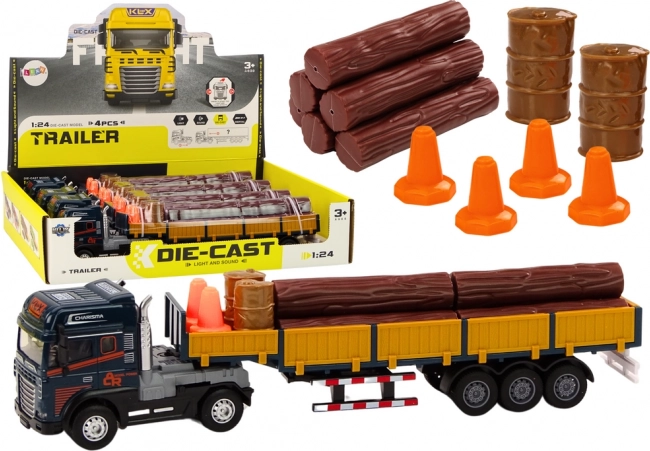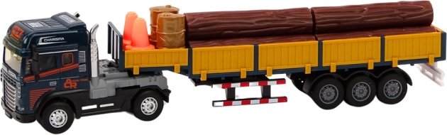 Modello realistico di camion in scala 1:24 con cabina blu, rimorchio staccabile con sponde removibili e carico di tronchi di legno. Per un gioco ancora più divertente dispone di effetti luminosi e sonori (avviamento motore, retromarcia) e di meccanismo a spinta/libero per la marcia. Inclusi anche conetti segnaletici portatili e due barili per scenari di carico e messa in sicurezza del “cantiere”. Certificazione CE, conforme a EN71, adatto dai 3 anni.