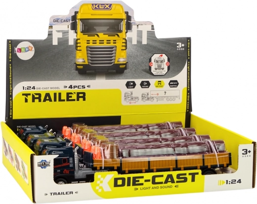 Modello dettagliato di camion con semirimorchio in scala 1:24 che offre ai bambini un gioco realistico di logistica e trasporto. La cabina blu e il rimorchio marrone con sponde removibili consentono un facile carico e scarico. Premendo la cabina si attivano luci e suoni – avviamento del motore e segnale di retromarcia – per un'esperienza ancora più autentica.