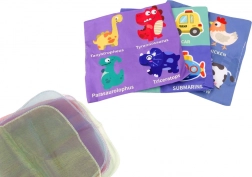All’interno della scatola ci sono tre involucri fruscianti con motivi diversi, dai dinosauri ai mezzi di trasporto. Questo elemento aggiuntivo stimola il tatto e l’udito e incoraggia il bambino a esplorare e scoprire. La presenza dei fazzoletti fruscianti consente inoltre di imparare a riconoscere i suoni.