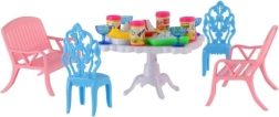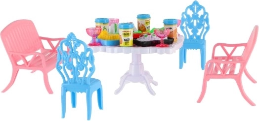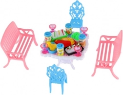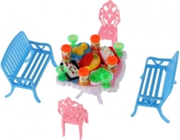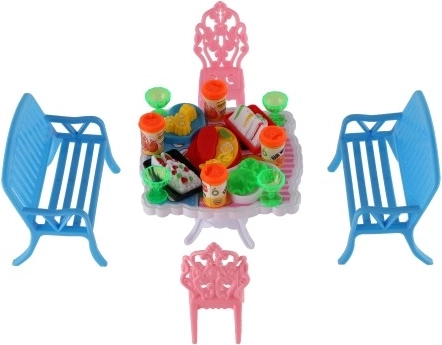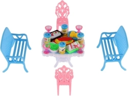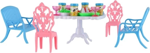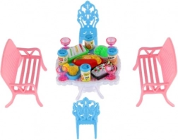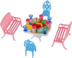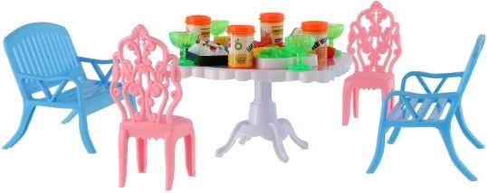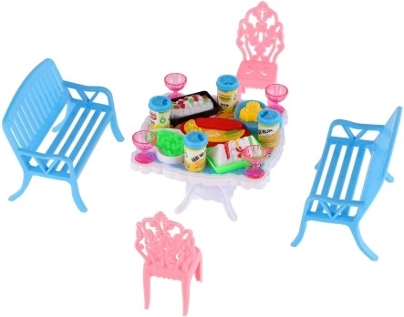 Il set include 2 panchine, 2 sedioline e un tavolo, completati da 13 pezzi di accessori – bicchierini, lattine, piatti e un vassoio. Tutto il necessario per il banchetto delle tue bambole.