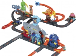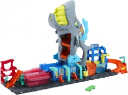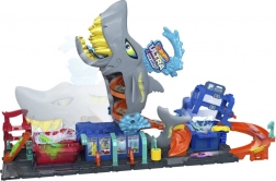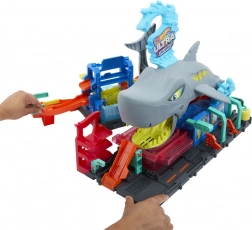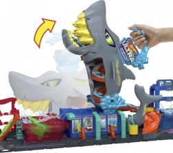 Scoprite avventure emozionanti con l'autolavaggio Hot Wheels City, dove il dominante squalo cattura i vostri bambini nell'azione. Entrate con il veicolo Color Reveal incluso, giù per la rampa, direttamente nella bocca spalancata dello squalo! Premendo la testa dello squalo cambiate il colore dell'acqua e guardate come rivela nuove decorazioni sul vostro veicolo.