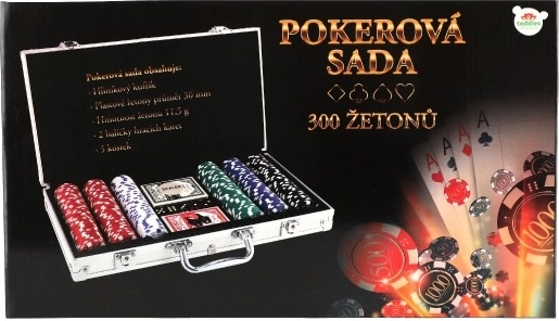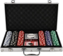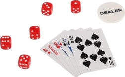 Il set include 300 gettoni in cinque colori diversi, due mazzi di carte da gioco e cinque dadi, consentendo di giocare a vari giochi di carte e di dadi.