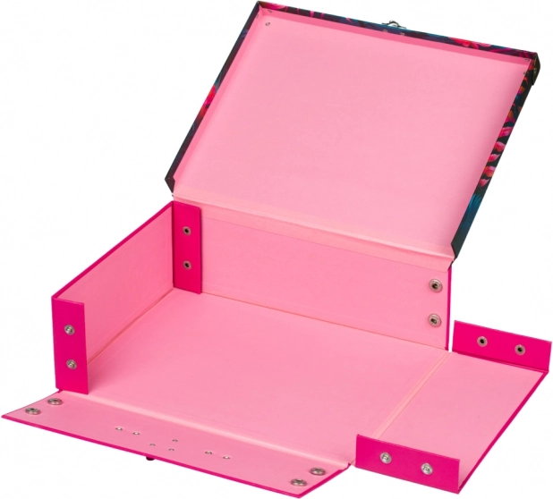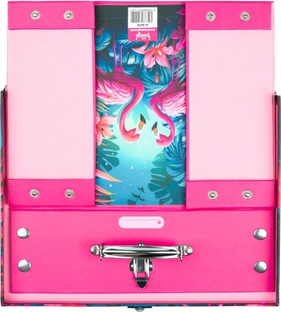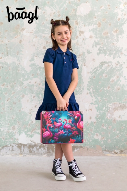Stilosa valigetta pieghevole con un motivo distintivo di fenicotteri e flora tropicale per studenti. Decorata con elementi in metallo per una maggiore resistenza e un aspetto elegante.