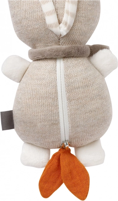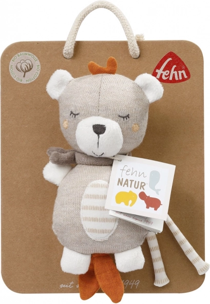 Il tenero orsetto di peluche, morbido, è realizzato in cotone biologico certificato. All'interno del peluche si trova un meccanismo a carica che, una volta tirato, suona una ninna nanna a volume piacevole. Due pratici nastri permettono di fissare il giocattolo al passeggino, alla culla o al seggiolino auto, evitando così di perderlo.