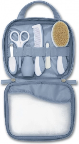 Scopri il set di cosmetici per neonati Powder Blue, una pratica borsa con strumenti essenziali per la cura del tuo bambino: forbicine, tagliaunghie, spazzola con setole in lana e molto altro.