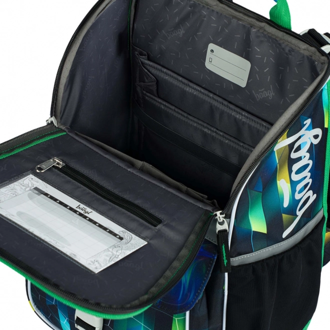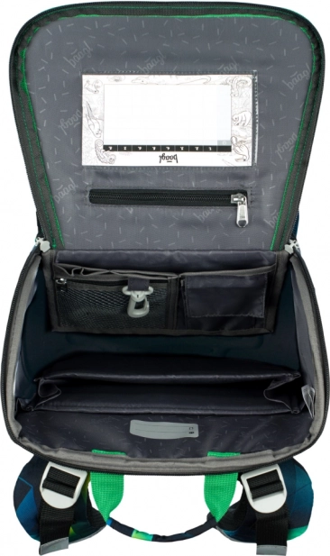 Il nuovo sistema di apertura a ribalta permette ai bambini di prendere comodamente il materiale direttamente dal banco. All'interno sono presenti un organizer con elastico, una tasca trasparente per l'orario e una tasca anteriore isolata.