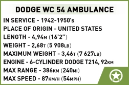 Questo kit realistico del modello Dodge WC 54 consente di ricreare un pezzo di storia con dettagli autentici. Il modello è in scala 1:35 e grazie alla licenza RAM TRUCKS offre alta qualità e precisione. Con i suoi 293 mattoncini e la minifigura sono ideali non solo per i costruttori, ma anche per gli amanti della storia militare.