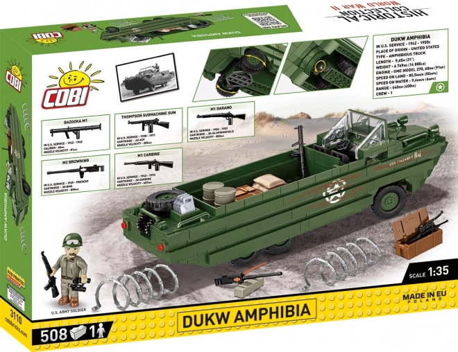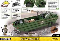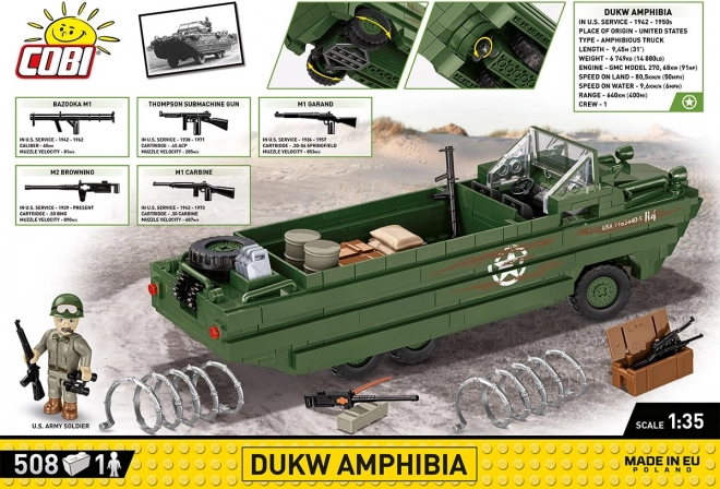 Il kit di costruzione Anfibi DUKW è progettato per gli amanti della storia e della tecnologia militare. Il modello è realizzato in scala 1:35 e presenta il logo ufficiale della celebrazione dell'80° anniversario dello sbarco degli Alleati in Normandia. Offrendo elementi realistici come ruote girevoli e un soldato americano con molti accessori, tra cui bazooka, fucili Browning, Garand, Thomson e M1. Nel vano di carico troverai casse, barili, taniche e una ruota di scorta.