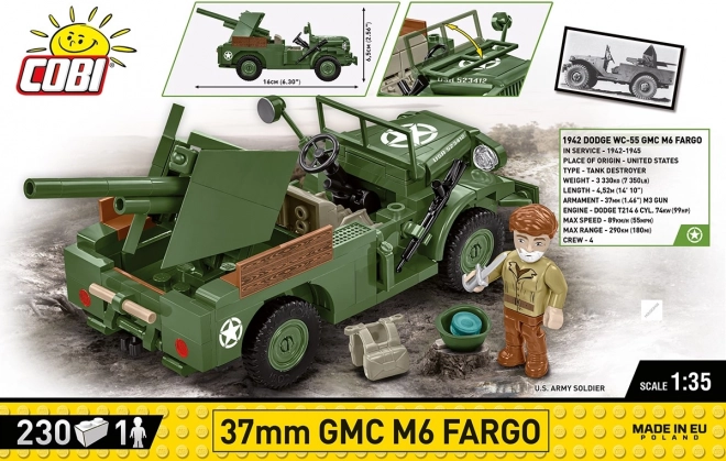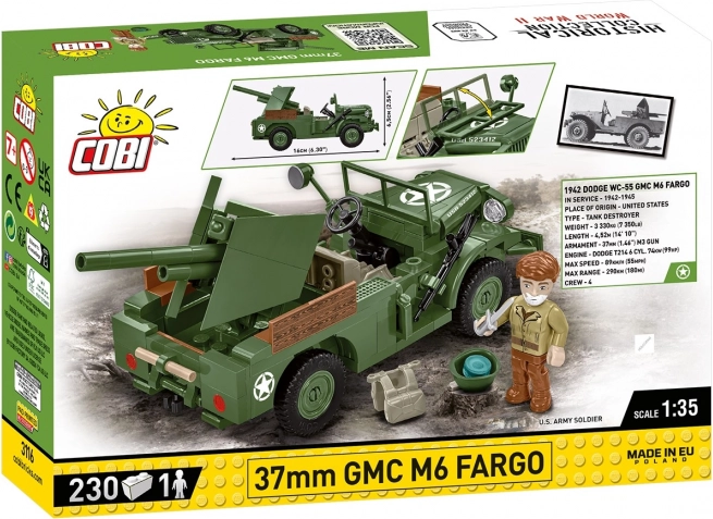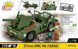 Il GMC M6 Fargo da 37 mm è un veicolo corazzato leggero americano utilizzato durante la seconda guerra mondiale. Sviluppato sul telaio del camion Dodge WC, era equipaggiato con un cannone anticarro da 37 mm M3, che lo rendeva efficace contro veicoli corazzati leggeri e fortificazioni. Questo modello a blocchi del marchio COBI è realizzato in scala 1:35 e si compone di 230 pezzi.