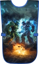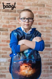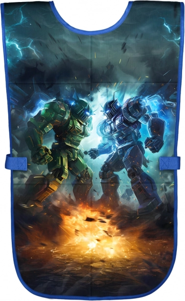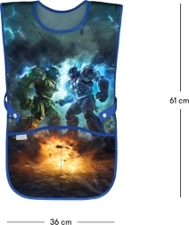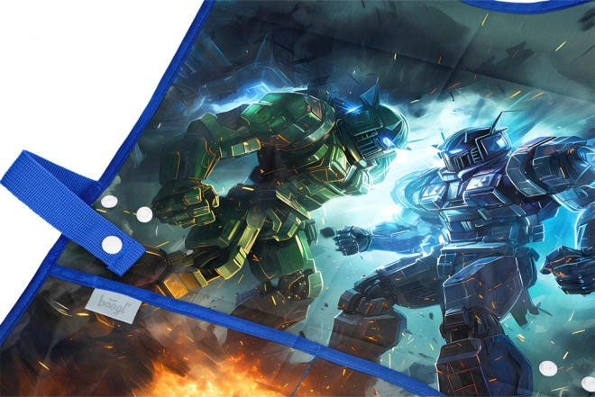 Pratico grembiule per bambini con motivo di robot del marchio BAAGL, ideale per educazione artistica, attività manuali e laboratori creativi. Offre un materiale lavabile per una facile manutenzione e due capienti tasche per gli accessori.