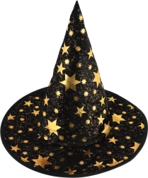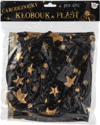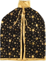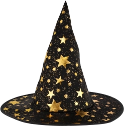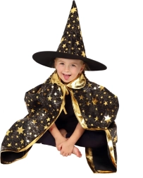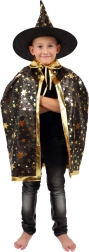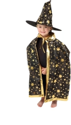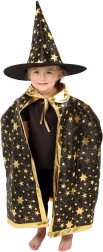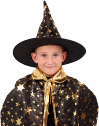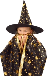 Trasformate il vostro bambino in un piccolo mago. Questo set nero‑oro con stampa di stelle include un cappello da strega/stregone vistoso e un mantello coordinato, ideali per carnevali per bambini, feste in maschera e celebrazioni di Halloween. Grazie ai materiali leggeri si indossano facilmente e consentono libertà di movimento durante giochi e spettacoli.
