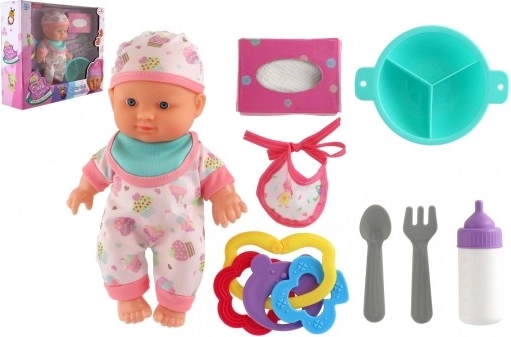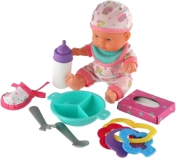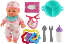 Nella confezione sono inclusi una biberon, un sonaglino, salviette umidificate e un set pappa per bimbi piccoli, che favoriscono un gioco realistico e sviluppano abilità motorie e ruoli sociali.