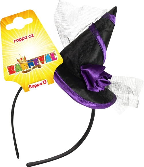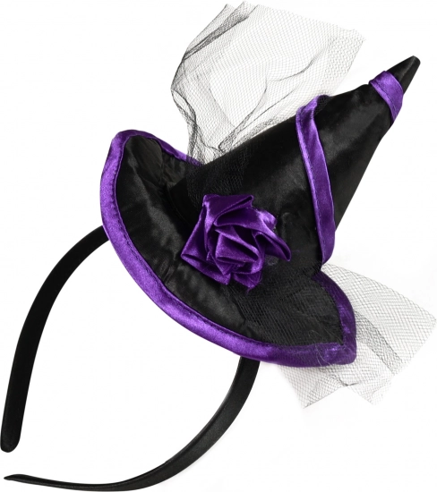 Elegante cerchietto da strega, l’accessorio perfetto per feste, carnevale e Halloween. Unisce una combinazione nero‑viola, un mini cappellino in raso e un fiore in tulle per un look deciso e fotogenico.
