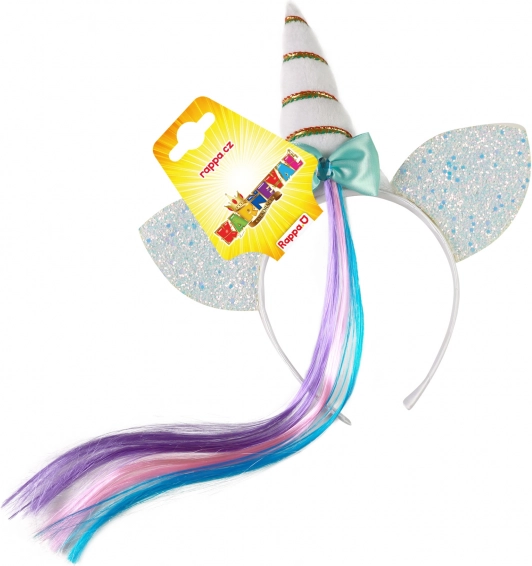 Il design combina il bianco con orecchiette argentate lucenti, un vistoso corno da unicorno e una ciocca arcobaleno che dona un effetto magico all’acconciatura. Il fiocco decorativo sottolinea l’aspetto delicato ed esalta il costume a tema.