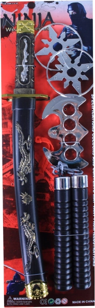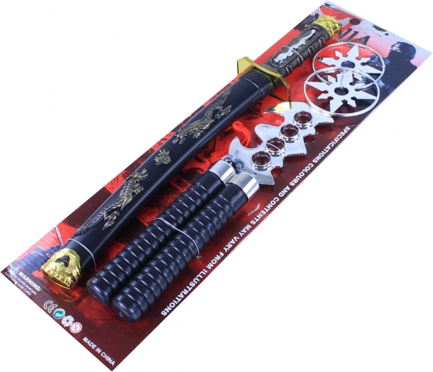 Grazie a questo set di giocattoli ninja, ogni piccolo guerriero può immergersi nel mondo delle arti marziali. Il set include una spada katana con fodero decorata con dettagli ornamentali e altri giocattoli come stelle da lancio e nunchaku per un perfetto gioco da guerriero.