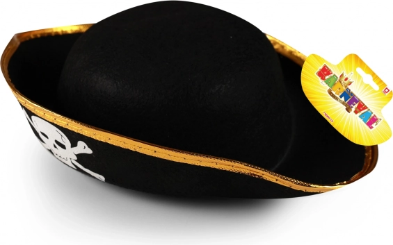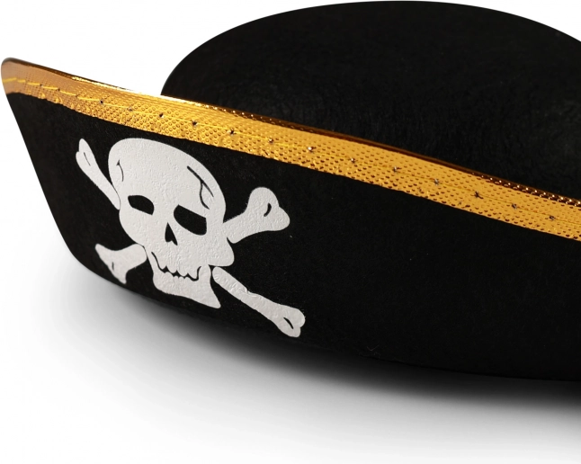 Elegante cappello da pirata per bambini, perfetto per piccoli avventurieri. Cappello nero con bordi dorati e un vistoso motivo di teschio frontale che dona al costume un autentico look piratesco e ti assicura di diventare la star della serata a carnevali e feste.