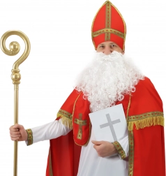 Il set include copricapo, tunica bianca, mantello rosso e stola con croce: basta aggiungere bastone e barba.