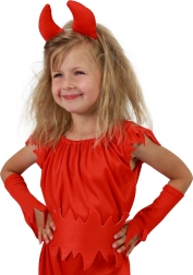 Abito, cintura, polsini e cerchietto con corna – tutto coordinato in rosso per un costume perfetto senza dover cercare accessori.