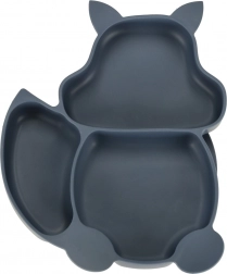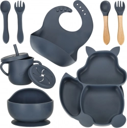 Set pappa in silicone completo da 9 pezzi per bambini con motivo scoiattolo in colore blu scuro. Include piatto a scomparti, scodella con ventosa, bicchierino con due coperchi e cannuccia, bavaglino e posate morbide. È senza BPA, resistente e facile da pulire in lavastoviglie – ideale per iniziare a mangiare in autonomia con ventose antiscivolo.