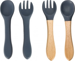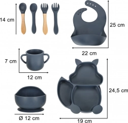 - piatto a scomparti, scodella, bicchierino con 2 coperchi + cannuccia, 2× forchettina, 2× cucchiaino, bavaglino in silicone