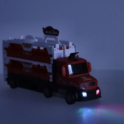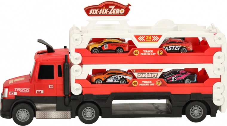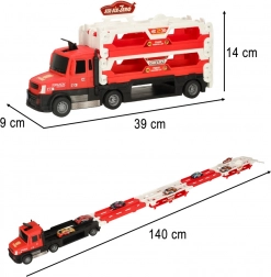 Il grande camion rosso funge da trasportatore di auto e allo stesso tempo da playset con circuito di gara nascosto. Una volta aperto, si crea una pista lunga su cui le 6 macchinine incluse possono sfidarsi. La rampa di lancio integrata dà una spinta potente alla partenza, mentre luci e suoni esaltano l’atmosfera delle vere competizioni.
