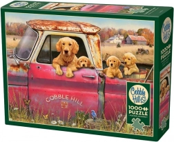 Un'illustrazione dettagliata di un camioncino rustico, fiori e quattro adorabili retriever porta un'atmosfera calda di casa e il piacere del puzzle.