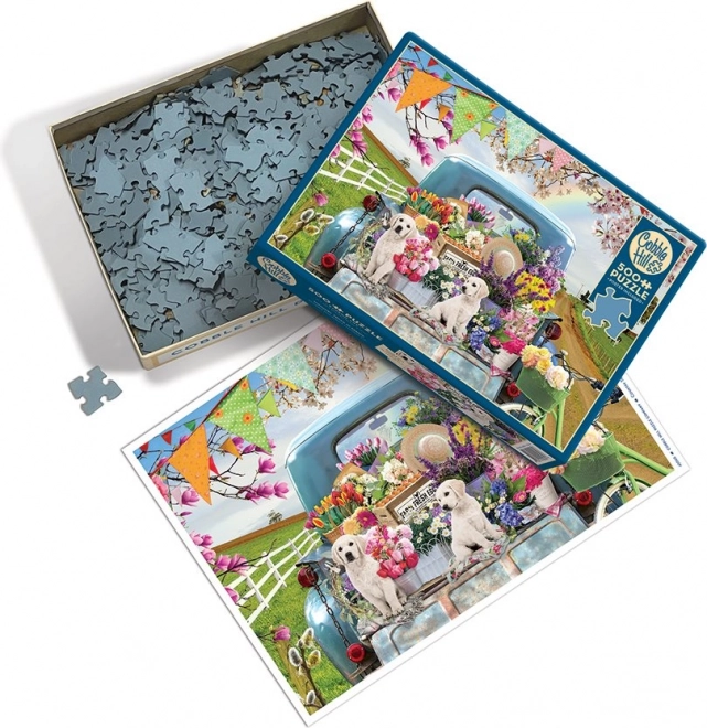 Il puzzle rappresenta una vivace scena rurale con un furgone vintage blu, fiori e cuccioli.