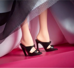 - La treccia a cascata, gli occhiali da sole a occhi di gatto, l'ombretto blu e le labbra rosse rendono omaggio alla prima Barbie! I lunghi guanti neri aggiungono eleganza al suo aspetto.