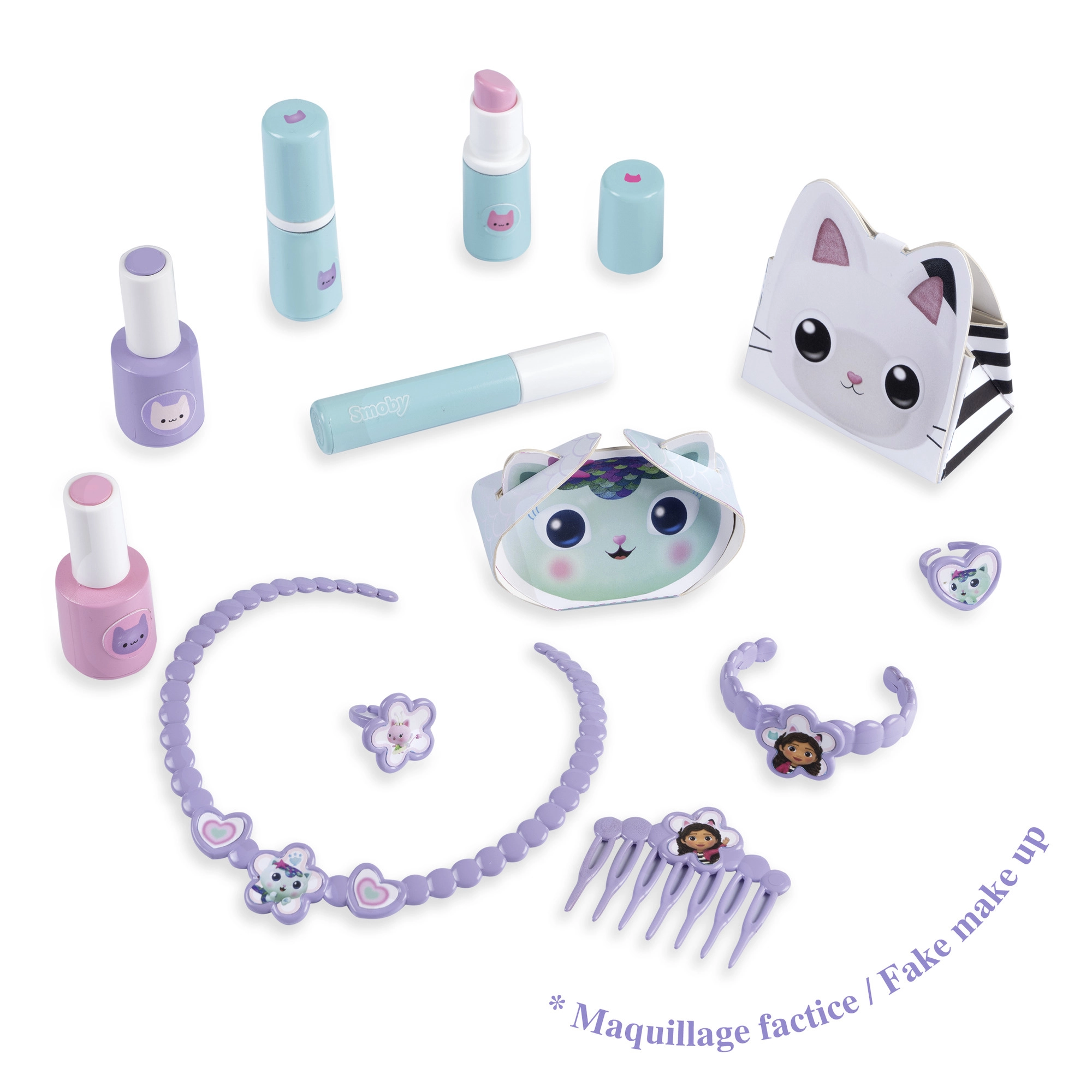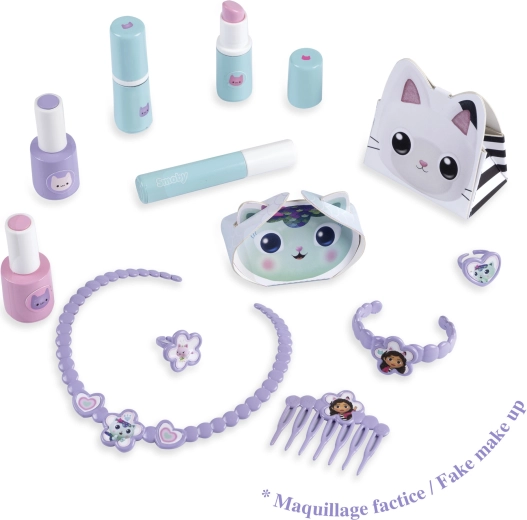 Inclusi “flaconcini cosmetici”, rossetti, mascara, pettine, collana, bracciale, anellini e altro ancora per un gioco realistico.