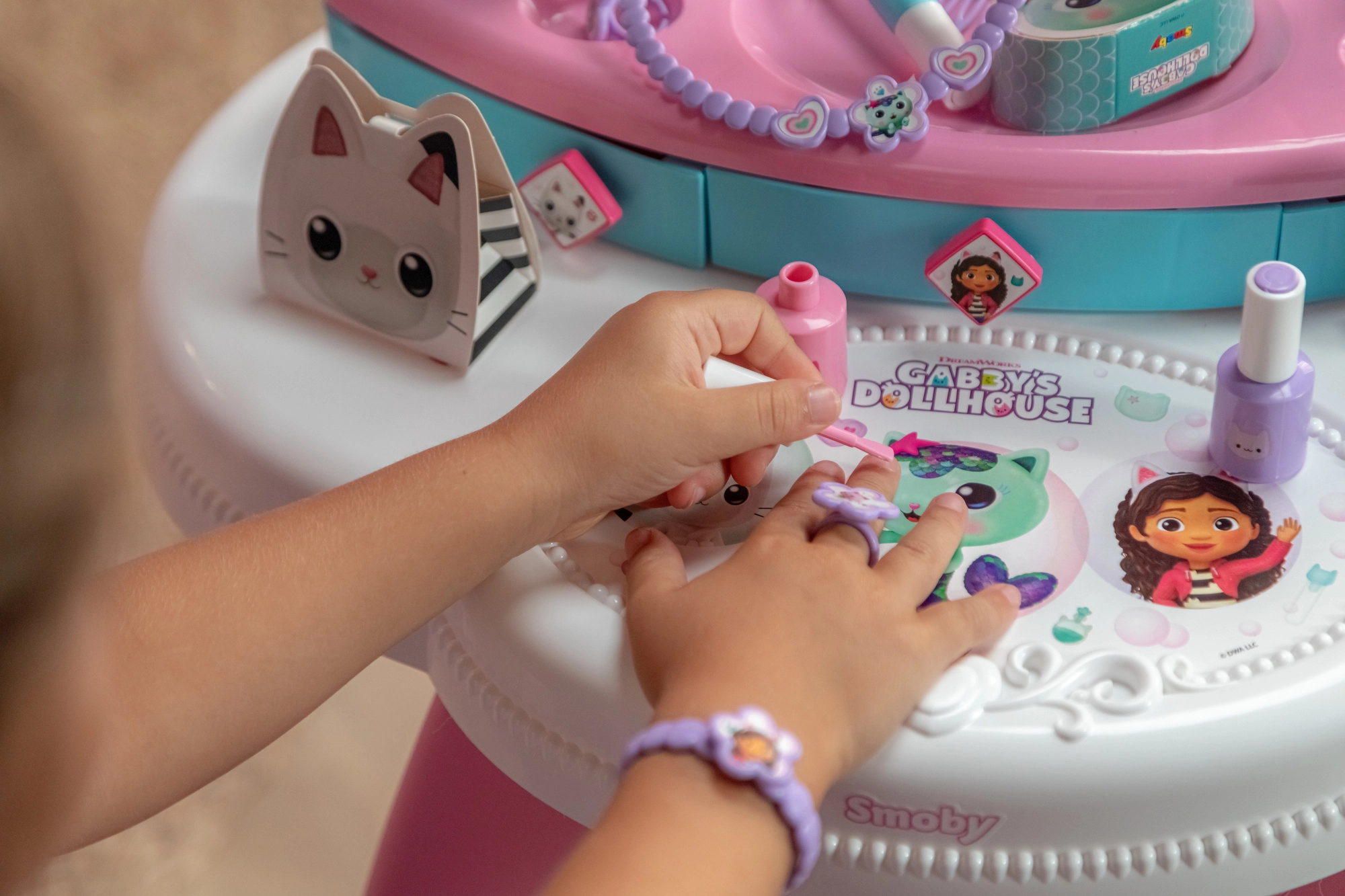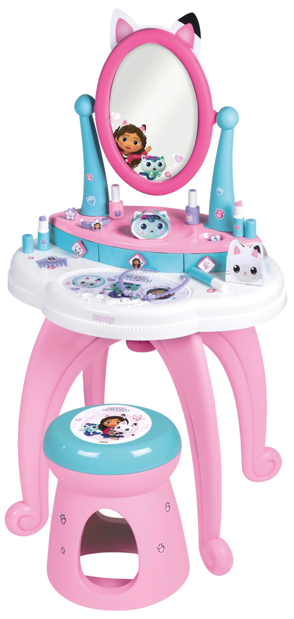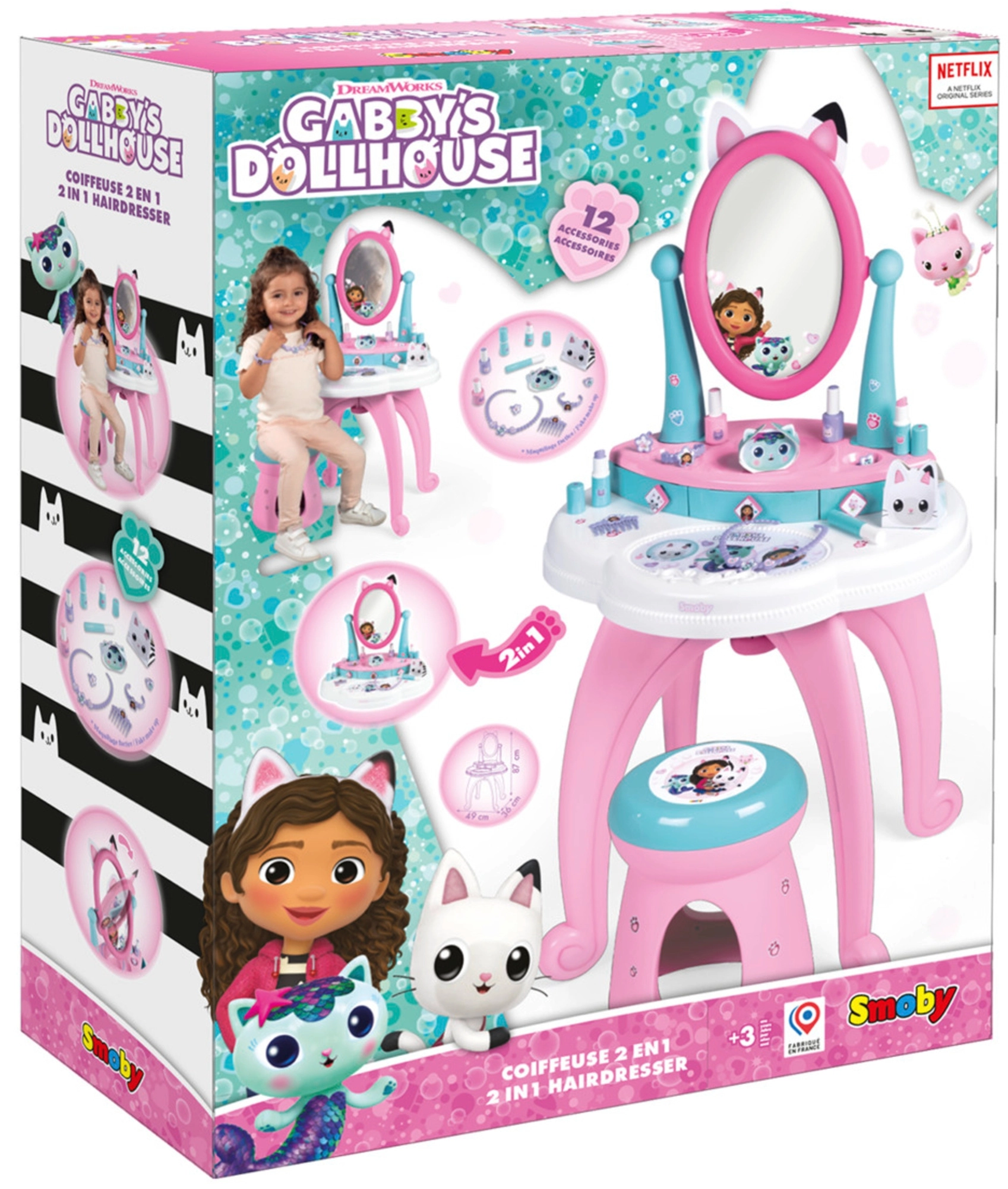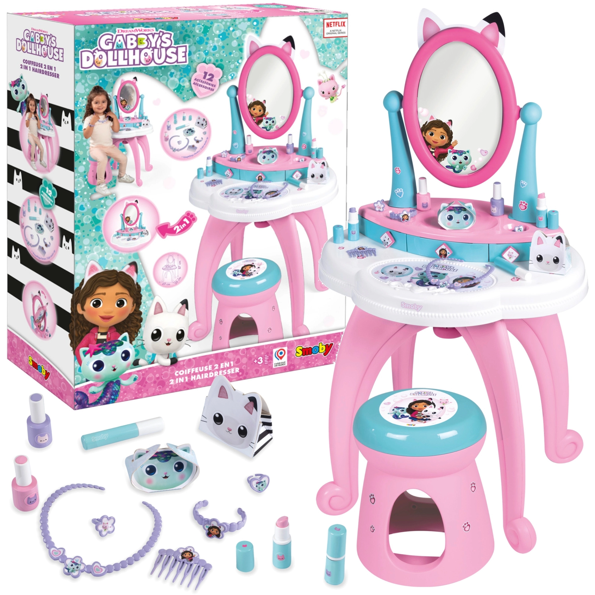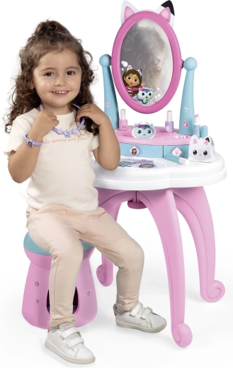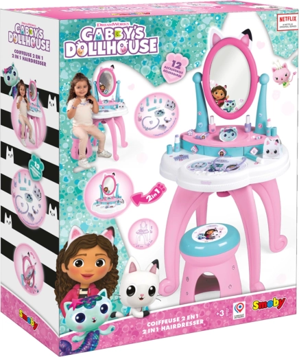 Entra nel magico mondo di GABBY’S DOLLHOUSE con il tavolino da toeletta 3 in 1 per bambini di Smoby. Offre asciugatura, trucco e cura delle unghie, ha un ampio specchio regolabile, 3 cassetti e un comodo sgabello. La confezione include 12 accessori per un gioco creativo che stimola la fantasia.