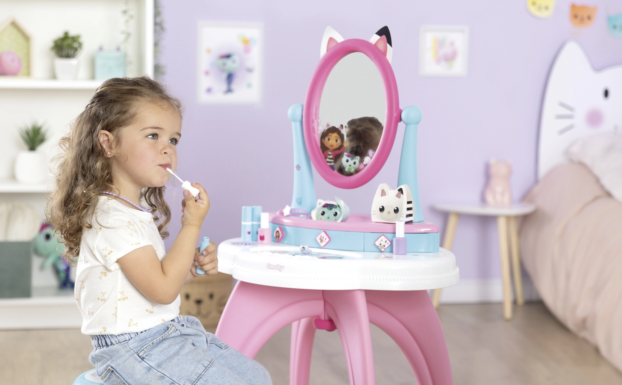 La toeletta per bambini ispirata alla popolare serie GABBY’S DOLLHOUSE trasforma la stanza in un piccolo studio di bellezza. Grazie all’ampio specchio regolabile, ai tre cassetti e al ricco set di accessori, tutto è a portata di mano per un gioco realistico e sicuro.