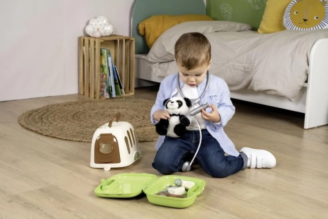 Stetoscopio, siringa, termometro, forbici, boccette, benda e ciotola: un corredo completo che stimola la fantasia e insegna ai bambini le basi della cura degli animali in modo sicuro e divertente.