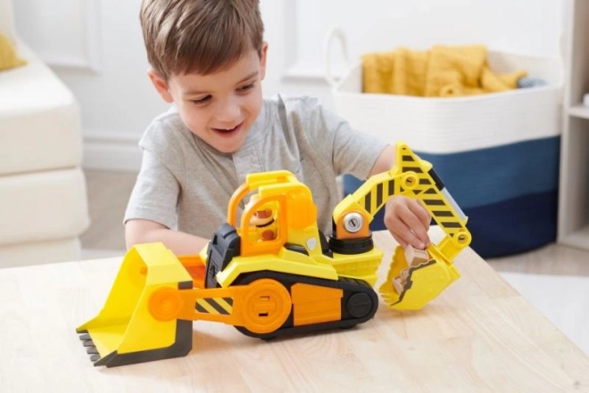 Il costruttore preferito parte al lavoro con la sua ruspa deluxe. I bambini possono sistemare la figurina in cabina e, con una semplice pressione, attivare luci lampeggianti ed effetti sonori realistici. La pala anteriore e il braccio escavatore posteriore sono completamente mobili, così scavare, raccogliere e caricare sarà un gioco da ragazzi.