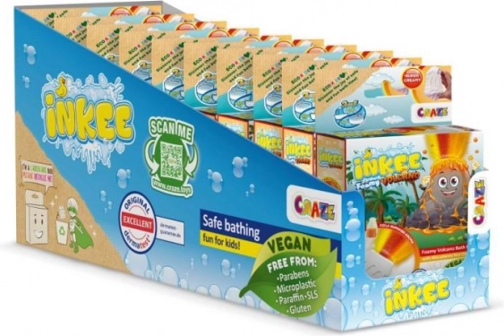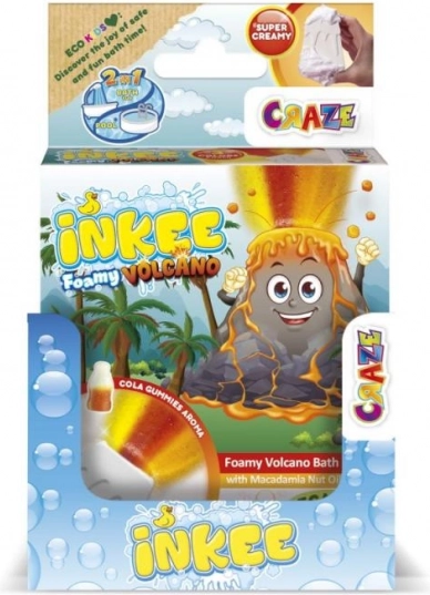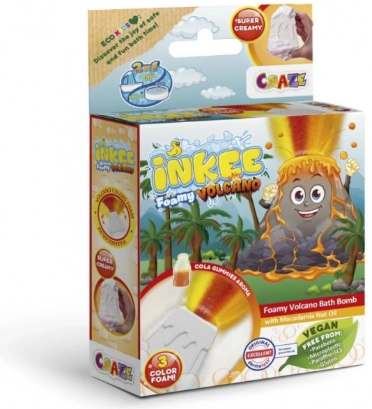 INKEE Foamy Volcano è una grande bomba da bagno da 110 g a forma di vulcano, che una volta immersa in acqua sprigiona getti gialli, rossi e arancioni creando un fantastico effetto eruzione. Durante lo scioglimento lascia l’acqua splendidamente arancione e riempie il bagno con una combinazione di profumi di fragola e cola gummies.