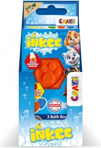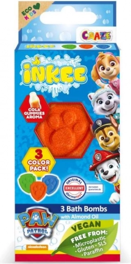 Trasforma ogni bagnetto in un'avventura divertente con le bombe frizzanti per bambini Inkee Paw Patrol. Nella confezione trovi 3 mini bombe (3 × 15 g) a forma di distintivo con zampetta in tre colori – blu, arancione e verde. A prendersi cura delicatamente della pelle dei bambini c'è l'olio di mandorle, mentre l'atmosfera giocosa è assicurata dalla popolare fragranza Cola Gummies.