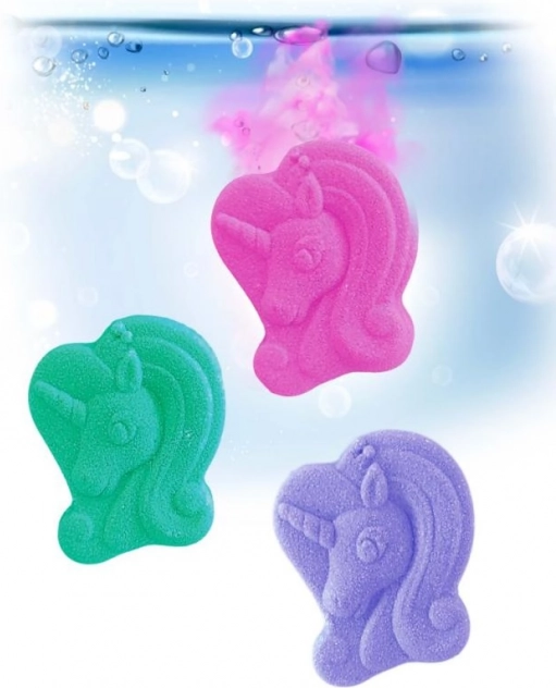 Ogni tavoletta, una volta immersa, inizia a sciogliersi frizzando e profuma il bagno di torta al caramello. Tre colori diversi – rosa, viola e verde acqua – donano a ogni bagno un’atmosfera unica. Ideali per i bambini che amano gli unicorni e i colori vivaci.