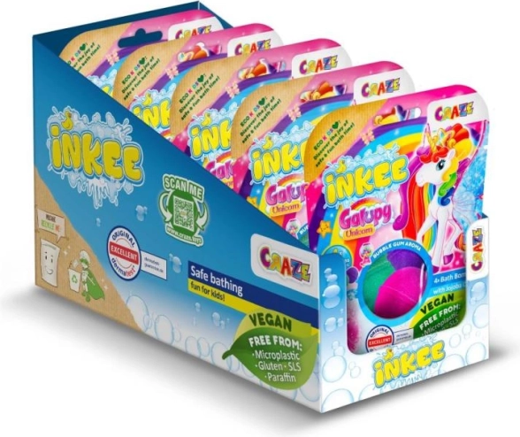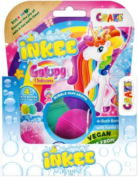 Porta gioia e colori nel bagnetto dei bambini con INKEE Galupy Unicorn. Ogni bomba frizza delicatamente in acqua, rilasciando colori divertenti e il dolce profumo di gomma da masticare, mentre il olio di jojoba aiuta a mantenere la pelle morbida.