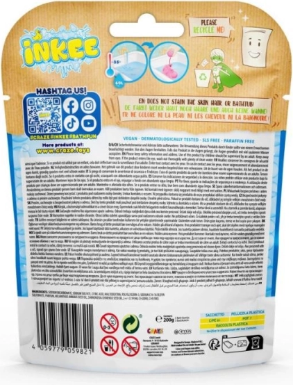I prodotti INKEE sono pensati per i bambini e per la natura – sono vegani, senza microplastiche, senza SLS, senza paraffina e adatti ai bambini dai 3 anni. Confezionati in una pratica bustina con finestrella per scegliere facilmente il colore.