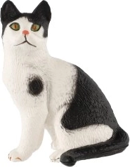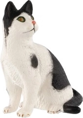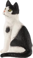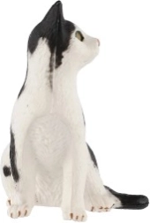 La texture fine del pelo, le proporzioni accurate e la colorazione bianco-nera risultano autentiche: la figurina sembra un vero gatto seduto.