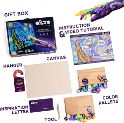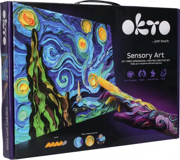 Scopri un'esperienza creativa con il set artistico Okto Sensoty Art – Notte stellata, ispirato al capolavoro di Vincent van Gogh. Grazie alla pasta autoindurente (air clay) e alla tecnica di pittura con le dita realizzerai un quadro a rilievo con livello di difficoltà 4/5. Ideale per sviluppare la creatività e rilassarsi, con una tela di 30 × 40 cm e tutto il necessario incluso nella confezione.
