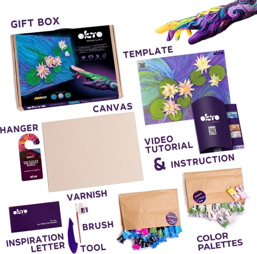 Scopri la gioia della creazione con il set artistico Okto “Ninfee” nel formato 30 × 40 cm. Nella confezione trovi tutto il necessario per la tua opera d’arte: tela naturale, pasta modellabile, vernice acrilica all’acqua, pennello, strumento modellatore in legno e istruzioni chiare.