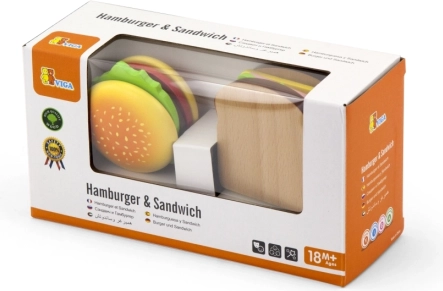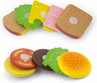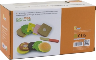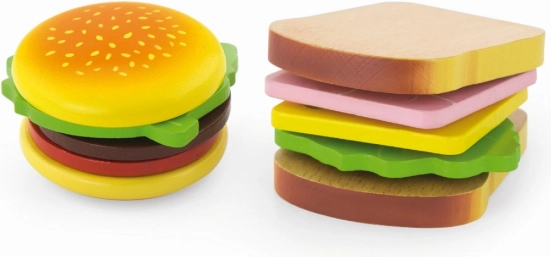 Questo set di hamburger e panini in legno VIGA è ideale per i piccoli che amano imitare gli adulti in cucina. I componenti in legno colorati e sicuri, come i panini, lattuga, pomodori e formaggio, permettono un gioco illimitato e creativo. Il giocattolo aiuta nello sviluppo di: