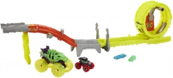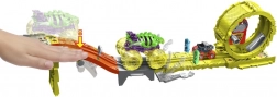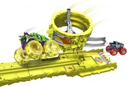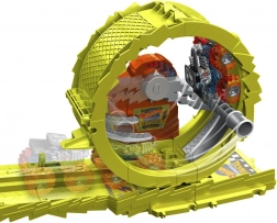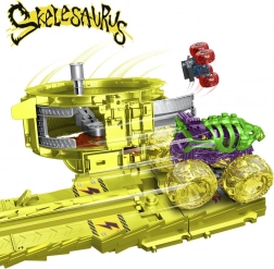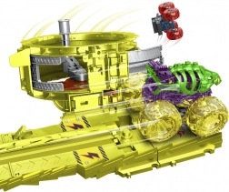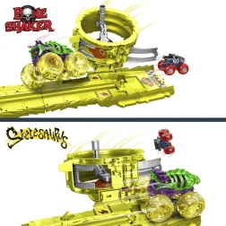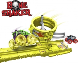 La pista Hot Wheels Monster Trucks Power Smashers offre uno scontro mozzafiato all'ultimo respiro! Lanciate contemporaneamente entrambi gli sfidanti e scoprite se Bone Shaker attraverserà il loop massiccio arrivando al sicuro, oppure se Skelesaurus lo catturerà a metà e lo ribalterà. Grazie al lanciatore e al design studiato, ogni corsa è diversa e piena di suspense.