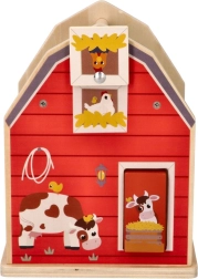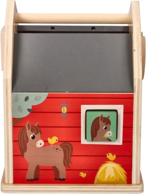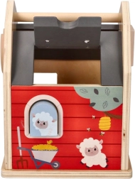 Casetta colorata e bifacciale a forma di stalla con simpatiche illustrazioni, pensata come giocattolo portatile.
