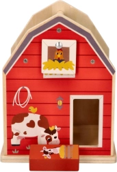 La scatola include cinque forme colorate che rappresentano diversi animali della fattoria come pecora, maialino e mucca, che i bambini possono inserire nelle aperture corrispondenti sulle pareti della fattoria. Le forme sono sufficientemente grandi per essere usate in autonomia.