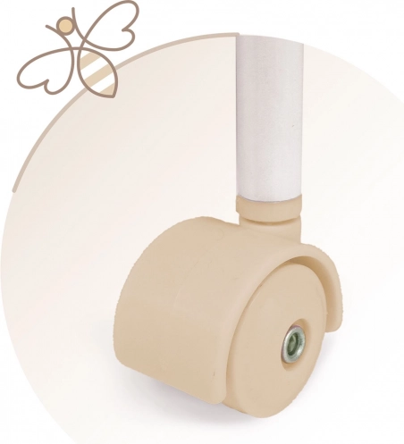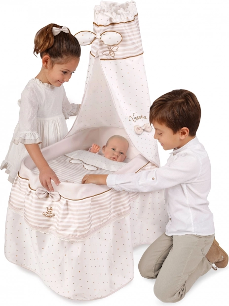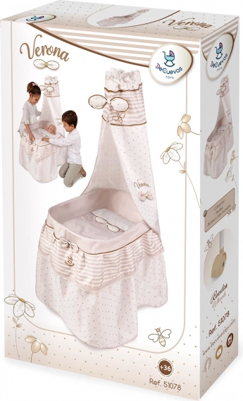 Questa culletta per bambole dal design raffinato è armonizzata in morbide tonalità pastello beige e bianco con discreti pois e righe. L’aspetto naturale è completato da fiocchetti che ricordano petali di fiori e da piccole ricamate apine, che sottolineano il fascino dell’intera collezione VERONA. Grazie alle ruote piroettanti, la culla può essere spostata facilmente da una stanza all’altra, così la piccola premurosa avrà sempre vicino il suo bebè.