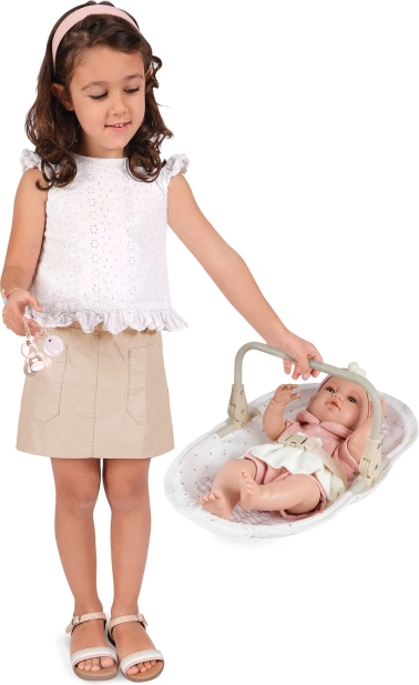 Questo seggiolone e altalena per bambole 3 in 1 della collezione Verona offre ai bambini un gioco realistico e tante possibilità di cura del loro bambolotto preferito. L’abbinamento di beige chiaro e bianco con motivi a pois e righe, rifinito con bordi discreti e applicazioni a fiocchetto, crea un look naturale senza tempo ispirato al design spagnolo.