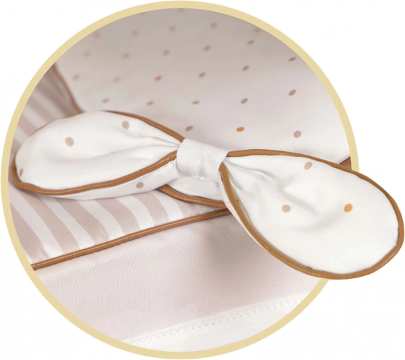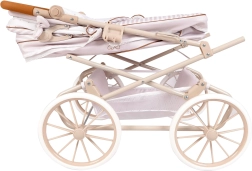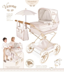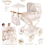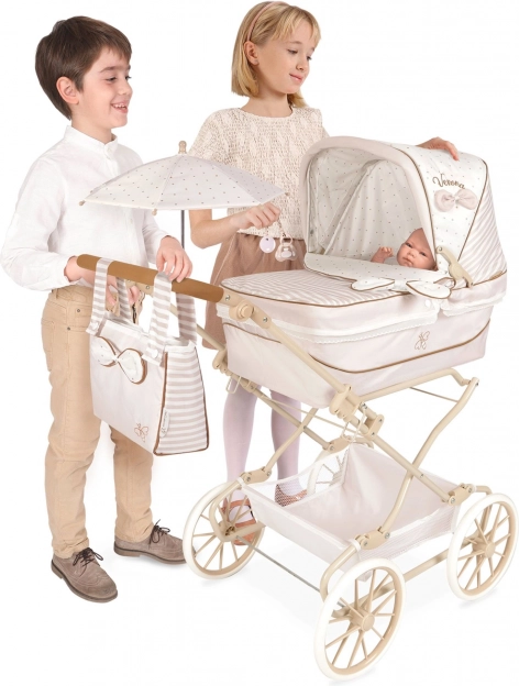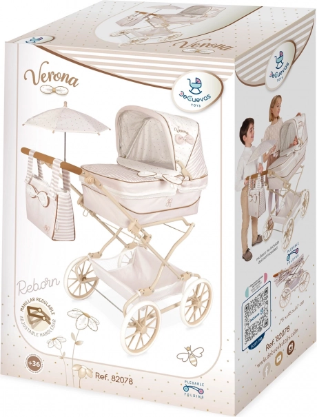 Incantevole passeggino per bambole REBORN Verona 2024 in combinazione beige chiaro e bianco con delicati pois e righe, colpisce per la precisa lavorazione spagnola e il design senza tempo. Grazie al manico regolabile in altezza (65–90 cm) si adatta perfettamente alla crescita del bambino ed è facile da guidare.