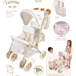 Scoprite il fascino della collezione Verona in delicate tonalità naturali e motivi. I tessuti beige chiaro e bianchi con pois e righe sono impreziositi da eleganti bordure e dettagli come fiocchetti e ricami di apine. Il passeggino gemellare è progettato per trasportare comodamente due bambole contemporaneamente e si distingue per la lavorazione precisa e il design spagnolo.